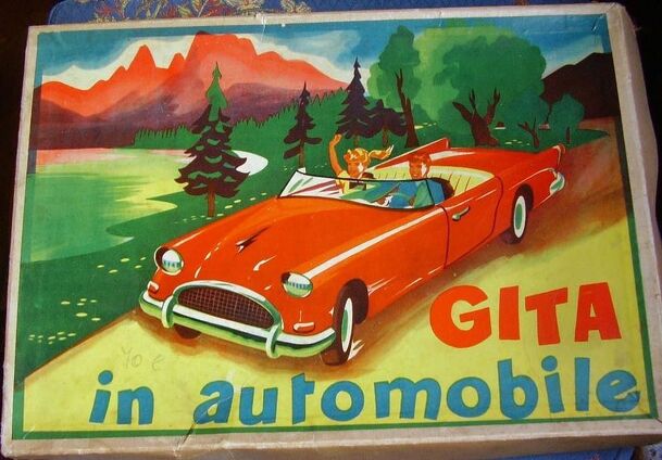 Double purposed Italian game from Milan published in the '60s. A simple roll and move game played with bikes or cars on the same track (Giro d'Italia). A cycling race and a car race can be played on the same board. The cycling game features three teams of two riders (whereas the car race features 6 independent cars) and the race consists of eight stages...