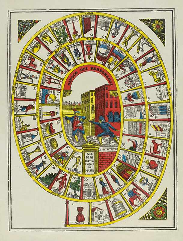 A children's boardgame printed in Italy during WWII. It seems that it was printed around the time of the Italian armistice. It is presumably produced in the areas of Italy occupied by Fascist forces as the three geese in the title are America, Britain and USSR and the board appears to give you advantages for landing on Axis themed spaces. It seems to be a...