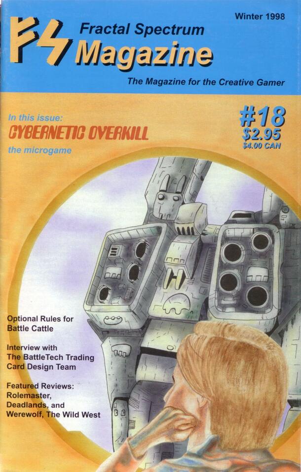 This microgame appeared in the magazine, Fractal Spectrum (FS), issue #18. It's an arena combat between two cyborgs. The rules, character sheets, and hex map are provided - players must provide 3d8 and counters with a recognizable front, as facing is important. Cyborgs are designed with five attributes: Aim, Melee, Dodge, Maneuver, and Skill. The map shows...