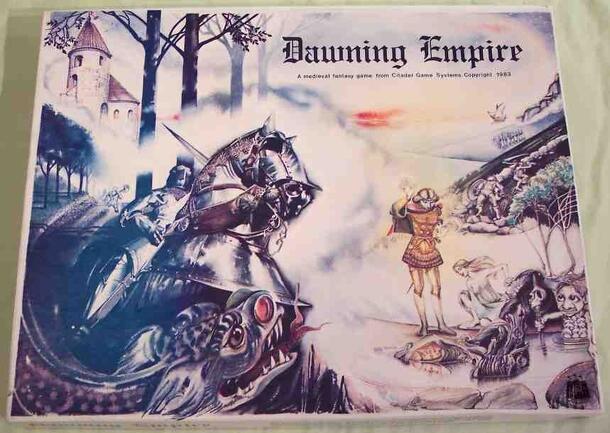 Dawning Empire is a multi-player fantasy wargame. The map shows an imaginary continent with the usual terrain features. Unusually, players choose their home kingdoms secretly using small replicas of the map - there are rules for players who overlap contesting the disputed area. Cities of the (presumably dying) Old Empire are placed randomly on the map....