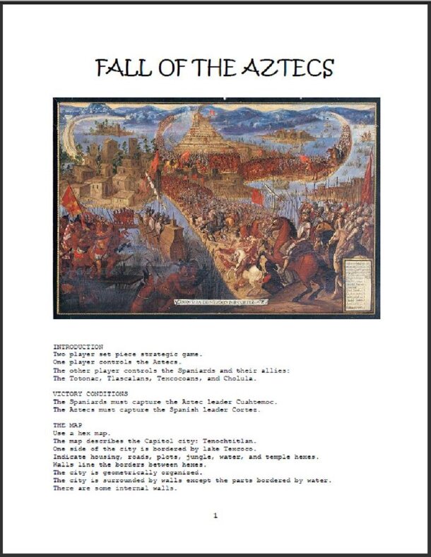 “Two player set piece strategic game. One player controls the Aztecs. The other player controls the Spaniards and their allies: The Totonac, Tlascalans, Texcocoans, and Cholula. Victory Conditions: The Spaniards must capture the Aztec leader Cuahtemoc. The Aztecs must capture the Spanish leader Cortez.” The battle is fought on a hex map depicting the Aztec...