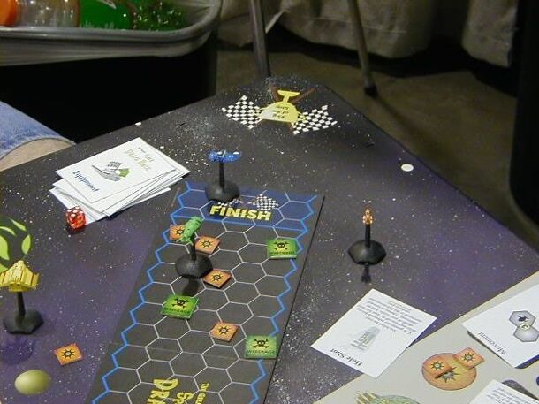 The Great Space Drag Race is a 2-4 player game designed for quick play, with games lasting 20-30 minutes. Included are 4 dragster Control Consoles, 88 play cards, 80+ counters, the track, dice, and four custom miniatures representing the dragsters. This game plays a bit like "Robo Rally lite," with players selecting cards in secret and arranging them in...