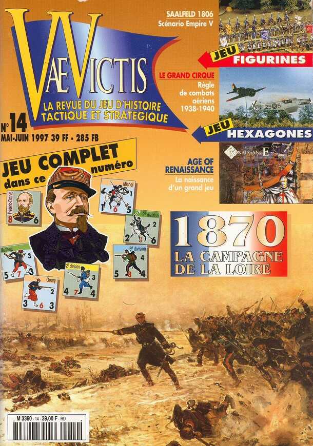 Vae Victis issue 14. This game covers some of the major campaigning in the Franco-Prussian War. The game features fog-of-war rules (hidden and dummy units), rules governing the destruction and repair of bridges and railroads (major themes of the campaign), and the crumbling and support of French national morale. The counters need to be cut out and mounted....