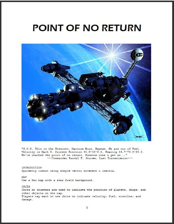 Point of No Return is a simple spaceship combat game. The game is played with counters on a hex grid. Movement alternates between players, one ship at a time. Combat is resolved simultaneously. A simple record is maintained for each ship, e.g.: Brazil (South American Warship) : 20 hull points, 2 Launchers, 2 Lasers, 2 Computers Features include: Abstracted...