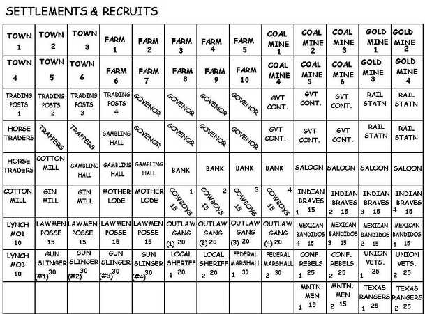 "Wargame of the American West circa 1840-1900. Players are rival Land Barons trying to gain complete control of the same territory. Victory: Control all Settlements on the Board. Players are eliminated if their Baron is killed." The game is played on a hex map showing thirty settlements. Each player chooses to play one of four ranches and the ranches are...