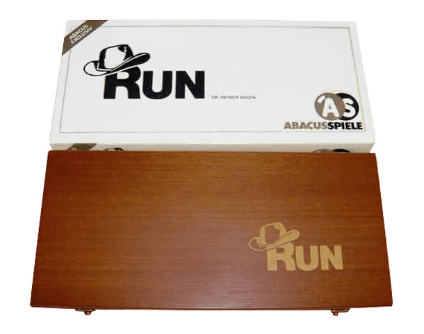 Run is one of Knizia's earliest abstract games. Players move one cowboy and one cow each turn in an attempt to move their cows safely across the board. A cowboy can take an opponent's cow. The game ends when all the cows for both players have exited the board or have been captured by cowboys. Scores are tallied for each player by determining how many of...
