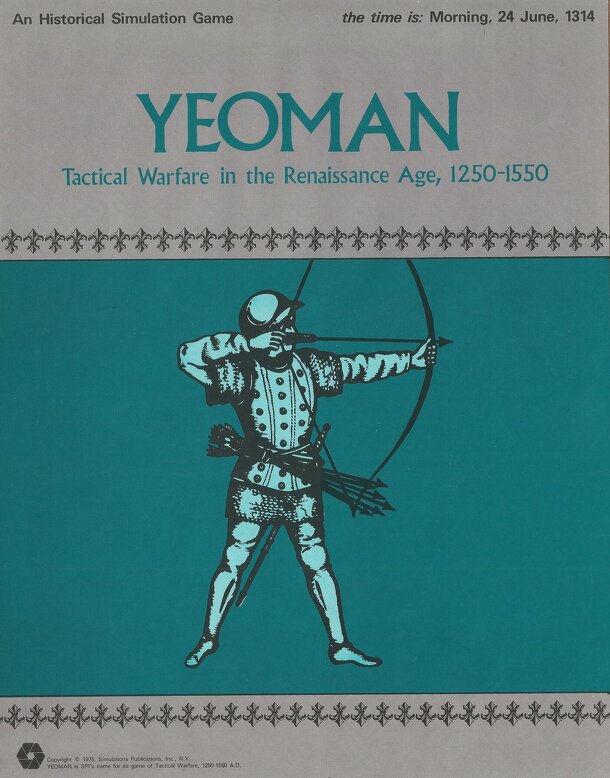 One of five games in a series by SPI called PRESTAGS (the others were Chariot: Tactical Warfare in the "Biblical" Age, 3000-500 BC, Spartan: Tactical Warfare in the Hellenistic Age, 500-100BC, Legion: Tactical Warfare in the Roman Age, 100BC-700AD, and Viking: Tactical Warfare in the Dark Ages, 700-1300), YEOMAN is a representation of the major battles...