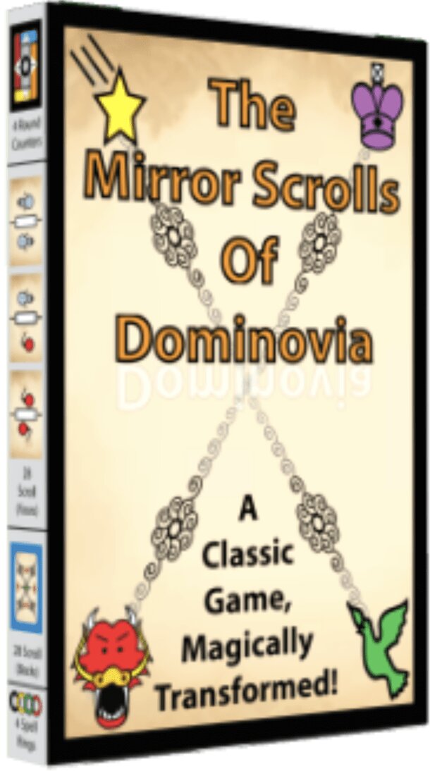 The Mirror Scrolls of Dominovia, is a Domino style game for 2-4 Mages (players) age 7 & up, lasting about 7 min, per Mage. During a game, Mages link (match) 1/2 of a Scroll (a Domino) in the play area, on either end of linked cards, with 1/2 of a Scroll held in a Mages’ hand to cast powerful spell. Linking your last Scroll in hand wins a round. Players set...