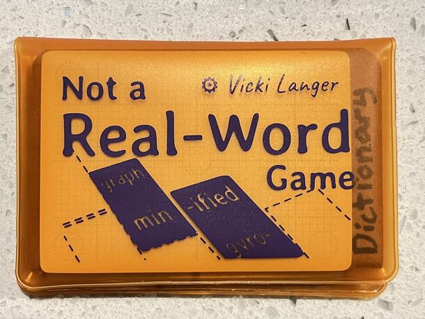 Not A Real-Word Game is a victorless game of making and using hyper-pleas-ify-ing words. In just a few minutes, you and your fellow neo-log-ists, will have created 15 or so of, your very own neo-log-isms to add to the Not A Real-Word Dictionary! Flippable domino-like cards allow you to choose which Word Particle(s) to align with word(s) already in the Play...