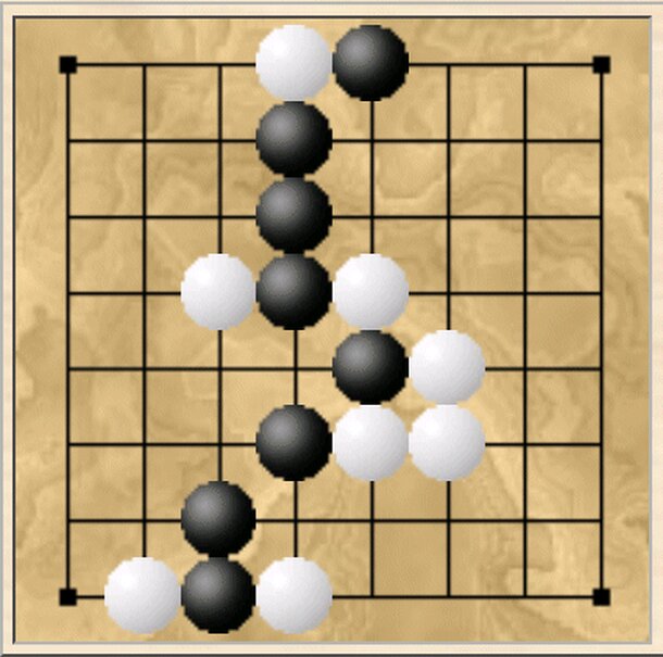 This game is played on a Go-like board initially empty. Larger boards imply more strategic matches. Setup. One player drops two black stones and one white stone. The second player decides to swap (and becomes Black) or continues as White. At each turn, each player must do the following sequence: • First, drop a friendly stone on an empty cell adjacent to...