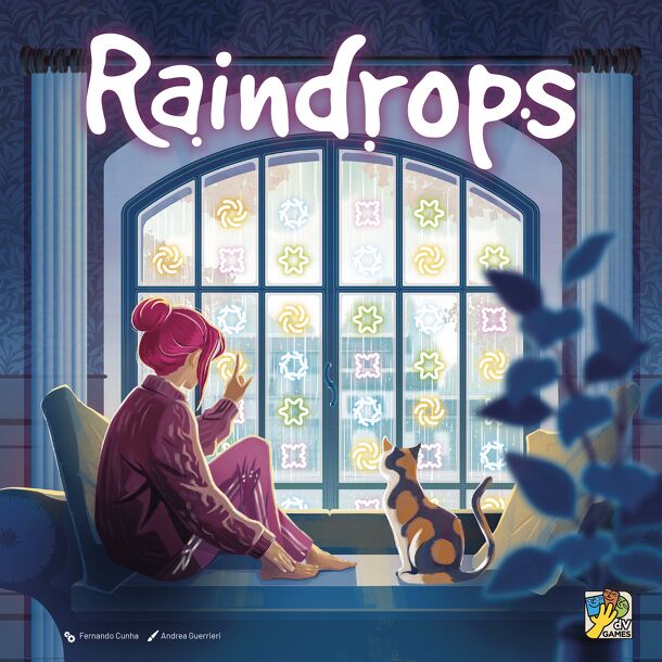 In Raindrops, players observe drops sliding down a window and identify their patterns, as their mind drifts to forgotten memories to be reconstructed. Raindrops is a tile-collection and pattern-recognition game for 2–4 players. On their turn, players select a continuous downward path of matching symbols on a shared window board, starting from the top row...
