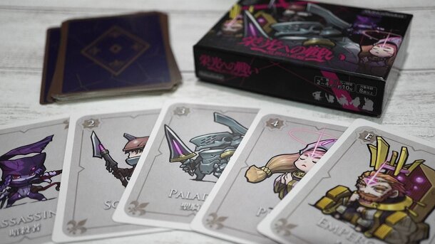 栄光への戦い~乱世の英雄 ("Fight for Glory: Heroes of a Turbulent Time") is a luck-based game where players each play a card facedown to reveal all at the same time. A strategy card (out of 3 different strategies)is picked at the beginning of the round by the first player , serving as the mechanic of the round (either dictating which card will win over which...