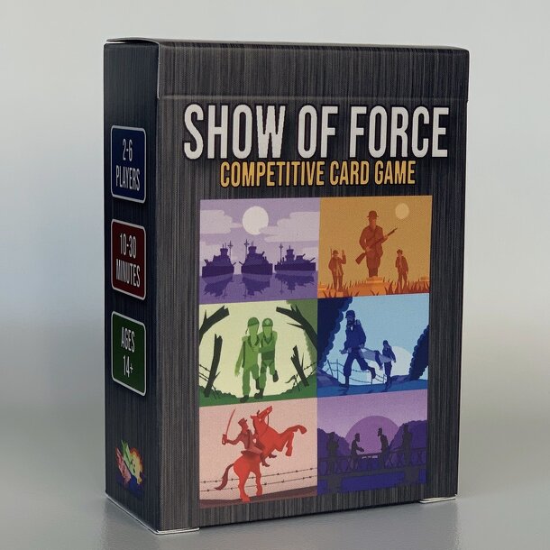 Show of Force (SOF) is a war themed competitive card game for players of all experience levels. SOF mixes the fun-for-everyone aspect of a party game, with the strategic gameplay of a trading card game. To win you must kill your opponents by bring their Health Points to zero. This is done with the uses of 5 card types: Attack cards to do damage; Benefit...