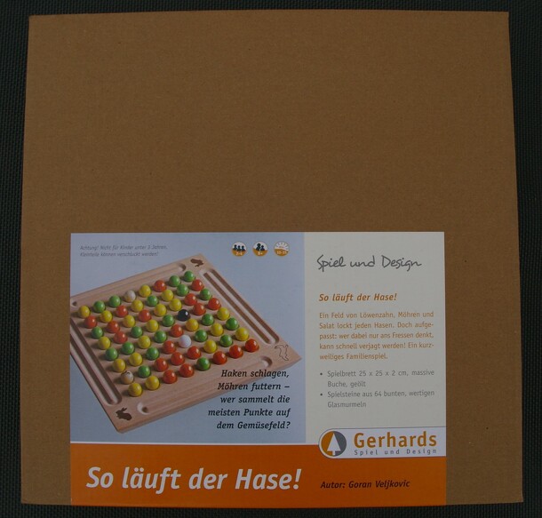 The game consists of a wooden board with 8 by 8 hollows (or 6 x 6 in the smaller edition for two players). These are randomly filled with marbles: Orange for carrots, green for salad and yellow for dandelions. Each player also owns a hare (a marble in a unique color) on the field. Players take turns hopping two fields forward and one to the side, picking...