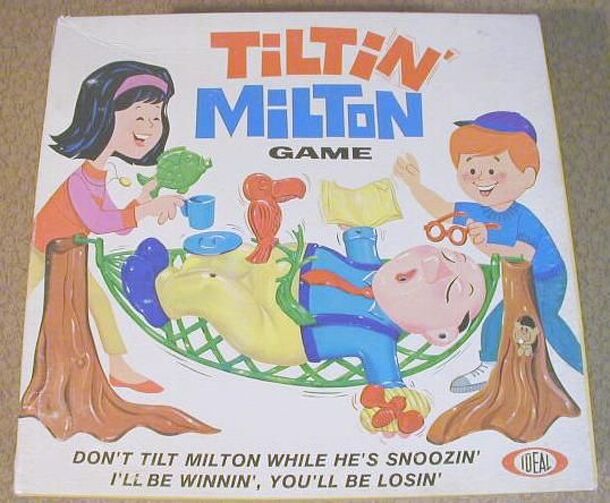 DON'T TILT MILTON WHILE HE'S SNOOZIN' ... ... I'LL BE WINNIN', YOU"LL BE LOSIN' so goes the rant on the box of this typical late sixties plastic offering from Ideal. The object is to place as many objects on Milton as possible without causing him to topple out of his hammock. Objects come in pairs - 10 large objects (e.g. bird nest, hat) and 10 smaller...