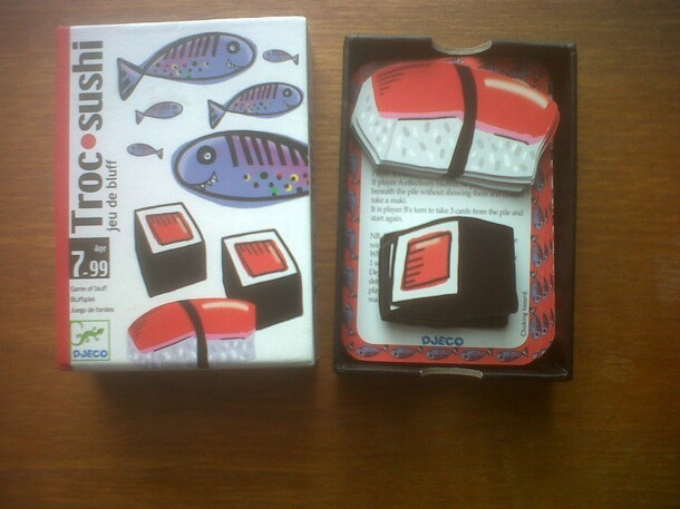 A bluffing game where the aim is collect the most maki and sushi possible by bluffing. Contents: 18 Fish cards numbered 0-3 Rule cards for 10 languages. 21 Maki tokens. 11 Sushi tokens. The deck of cards are shuffled and the first player draws the top three cards and secretly announces a score lower than or equal to 9. There are then the 2 possibilities....