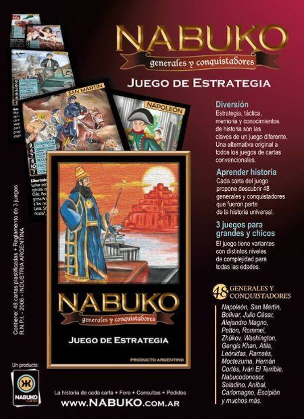 From the editor´s webpage: PARTICIPANTS. 2 players. OBJECTIVE. Leaving the opponent without cards. GENERAL IDEA. Each player has in its hands 24 of the most prominent general and conquerors of history. The way to organize them and how to use them determines the winner. KEY. 1. Knowing the history of every conqueror to use their items that are crucial in...