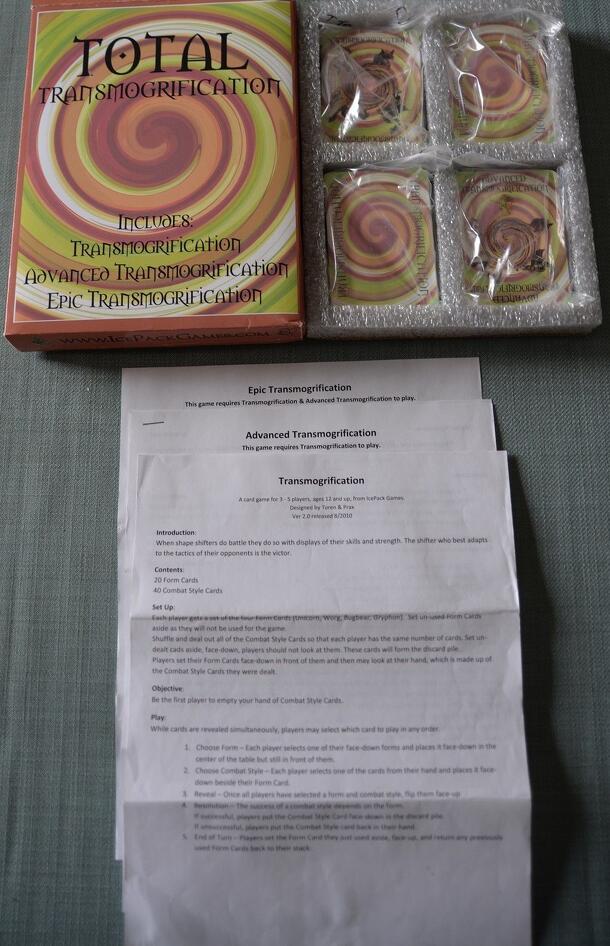 Adds 25 Advanced Form Cards. Requires 5 Original Form Cards, and 20 Combat Style Cards from Transmogrification to play. Set-up, objective, play and winning remain the same as Transmogrification. Set Up Each play gets one set of the four Form Cards. Unused Form Cards are set aside. The Combat Style Cards are shuffled and dealt out until each player has an...