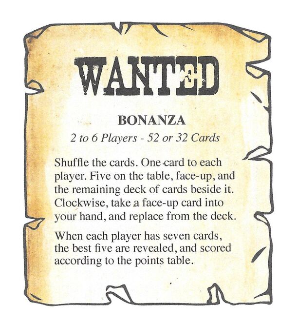 In Bonanza, players draft cards from a common pool to create the strongest poker hand. One card is dealt to each player. Five cards are placed face-up to the table. In playing order, each player takes a face-up card from the displayed selection, then replaces the drawn card with a new card from the deck. This is done in turn order until each player has 7...
