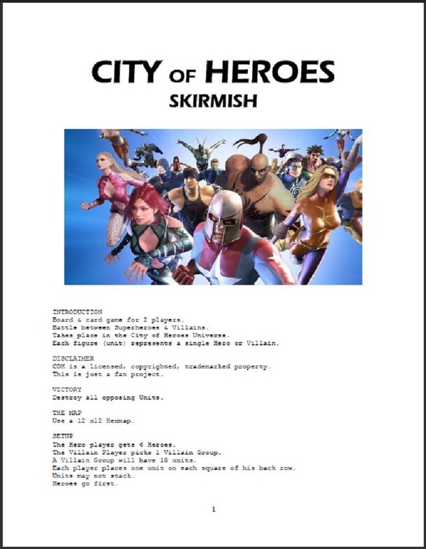 “Battle between Superheroes & Villains. Takes place in the City of Heroes Universe. Each figure (unit) represents a single Hero or Villain. Victory: Destroy all opposing Units.” A non-collectable game based on the City of Heroes CCG. The game is played on a 12x12 hex map. The Hero player picks six Heroes and the Villain player picks one Villain group. The...