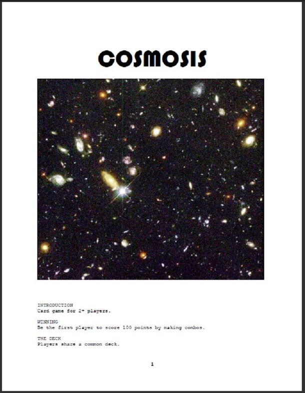 A card game themed around celestial bodies. The object of the game is to be the first player to score 100 points playing combos. The game uses a custom card deck that includes six kinds of cards: Active Galaxy, Galaxy, Stellar Object, Main Sequence Star (MSS), Planet, and Special cards. There are a number of different combo hands that may be played. You...
