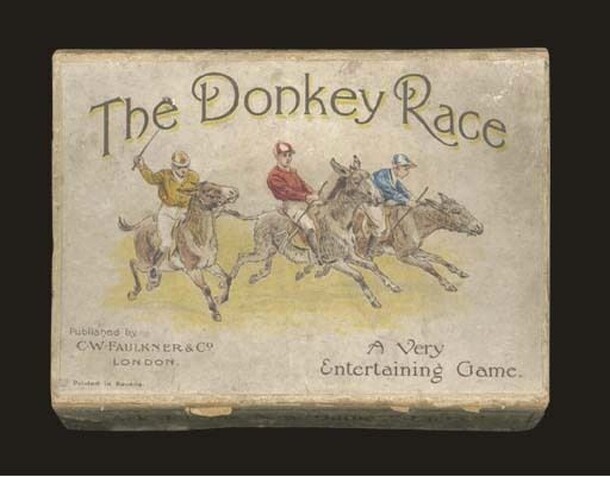 Five cards depict jockeys riding donkeys, the jockeys are named Gallopaway, Speed, Energy, Lightfoot and Beauty. The jockeys wear distinctive colors that match obstacle and numeral cards which, when turned face up, count for or against the jockey wearing the same color as marked in the upper left hand corner of the card. Card back design reads,"Honni Soit...