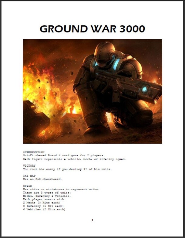 “Sci-Fi themed board & card game for 2 players. Each figure represents a vehicle, mech, or infantry squad. Victory: You rout the enemy if you destroy 9+ of his units.” The game is played on a chessboard or any other 8x8 grid. Miniatures or counters are used to represent the combat units. Each side starts with sixteen units: two Mechs, six Vehicles, and...