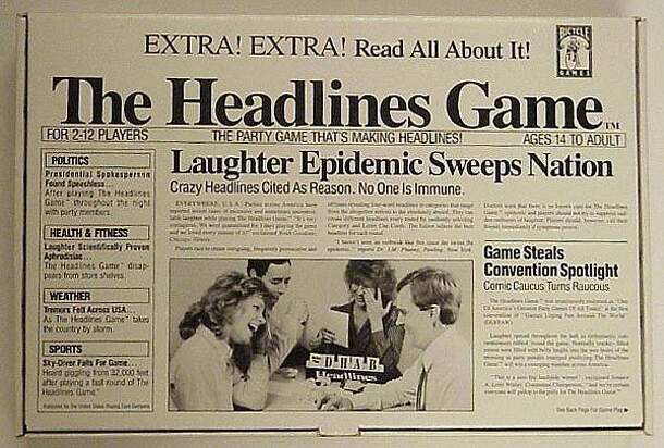 In this party game, players try to create headlines for a newspaper. They are given 4 letters, a theme and about 3 minutes to make as many headlines as they want. The words in the headlines need to start with the 4 given letters in the given order and the headline needs to fit into the given theme. Example: Letters: S, B, N, R Theme: Society Headlines...