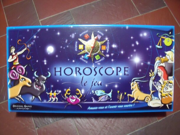 In French, from the back of the box : "Jouez avec votre signe astrologique + de 1000 questions, prédictions et défis 6 thèmes : Amis, Amour, Argent, Chance, Energie, Travail Répondez, devinez, tentez la chance et... provoquez vos adversaires : bataille de dé, bluff... Gagnez en étant le 1er à faire le tour des 12 signes !" In English : "Play with your...