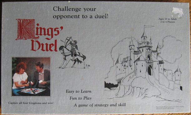 Contents: Instructions Game board 4 sets of checkers (1 set each of red, blue, white, & black) 4 playing pieces with flags (1 each of red, blue, white, & black) 2 standard decks of playing cards The game is played on a cross-shaped grid of five three-by-three blocks, with a 'king's space' at the terminal end of each branch. The players each start on a...