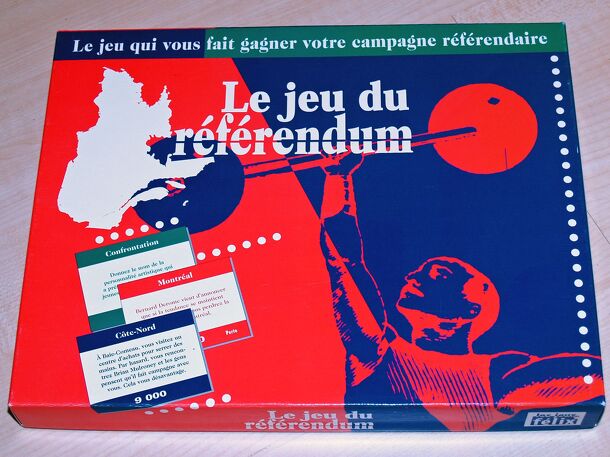 In teams, or one on one, you are trying to make your side victorious in the Québec referendum. By moving from region to region, you're collecting cards that will give you votes (points) at the end of the game. When pawns meet in the same region, a trivia question is asked to the player who has just landed. If the player fails, the other team can try to...