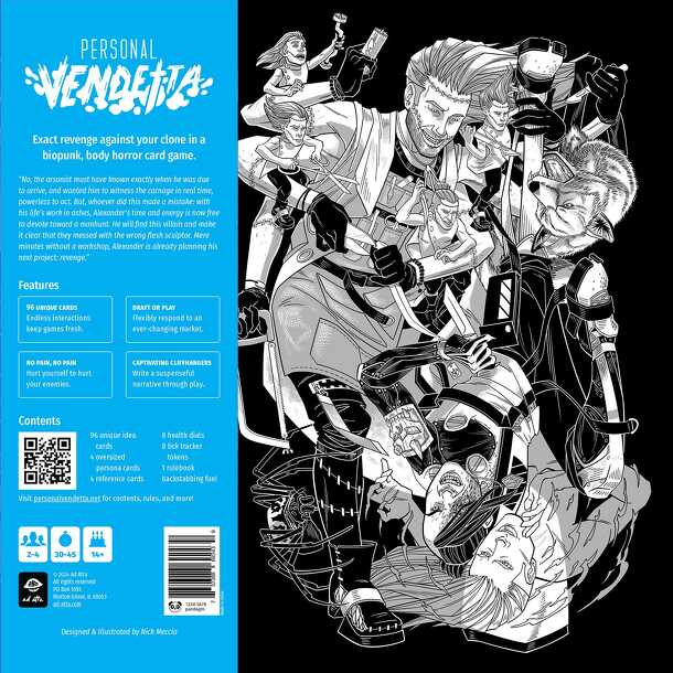 Exact revenge against your clones in a biopunk, body horror setting. In Personal Vendetta, each player is a clone fighting for revenge against their duplicates. Cards and game actions reflect the physical and psychological toll of confronting your own worst enemy: yourself. Attack your foes to inflict damage, react to their schemes to turn the tides of...