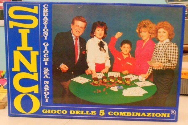 A kind of Lotto for Christmas time. Instead of numbers, the game uses a traditional deck of Neapolitan cards, 40 in all in the traditional Italian-Spanish suits of Clubs, Coins, Cups and Swords. Each player has a mat showing 25 cards making several combinations of 5 cards each. The scores go from the single central card to 5 cards combinations, or Sinco....