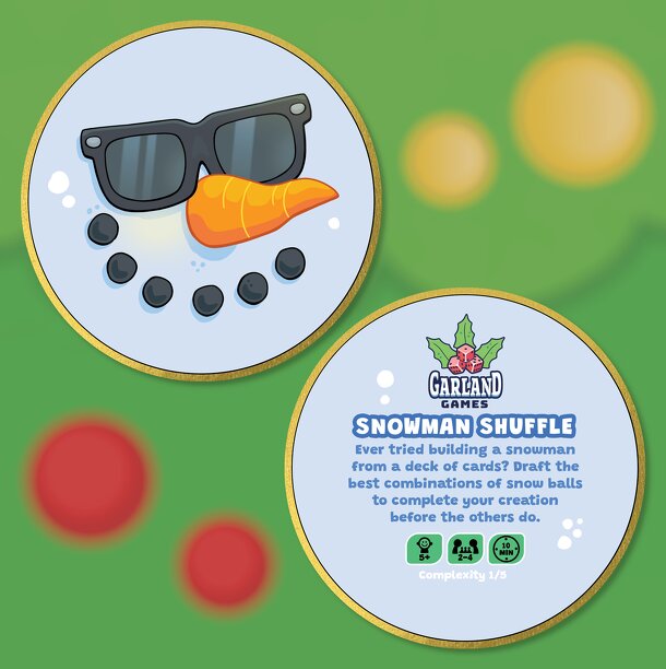 Snowman Shuffle is a cozy drafting game. Players must first roll snow, moving cards between the 16 piles, and then they must choose any of the top cards to draft onto their snowman. The snowman's base tells you your target colors and shapes, with each matching button on the chest, head, and hat giving you points. After everyone has built 3 snowmen, the...