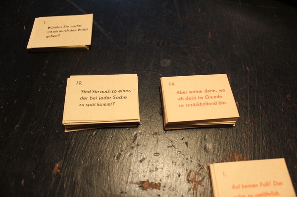 The German title of the game Spaß muß sein! means "Fun must be!”. This is a simple card game, printed 1958. The game includes 100 cards of two types. The blue one with a ques-tion, and the red one with a answer. You have to through a card with a question. A other player has to choose answer. It’s up to you to decide if the answer is fitting or just fun....