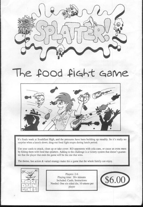 The game comes with 48 cards and a set of instructions. The players need six-sided dice and to provide a set of 10 tokens for each player. Turn Sequence: 1. Discard one cover card 2. Draw one card 3. Perform one action a. Clean up b. Attack c. Draw one card 4. End of Turn "Clean up": Any number of cards can be discarded to remove 2 "mess points" each....