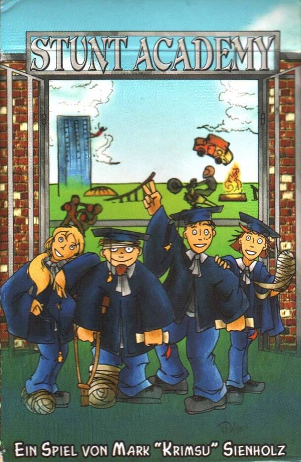Players represent slackers trying to turn their lives around and become stunt men or women. But one can't simply fall off a building or get blown up, nosireebob! It takes training to abuse yourself! So over 4 semesters players draft cards and spend action points to prove who will graduate at the head of the class. Features a clever disappearing queue of...