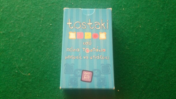 Tosti! is a simple game (created by a child for children) about building sandwiches, specifically tostis, a Dutch version of a grilled cheese. Players share a deck of translucent cards showing bread, cheese, ham, onions, and tomatoes. On their turn, players will draw a card to start a new sandwich, place it on an existing sandwich, or put it on the bottom...