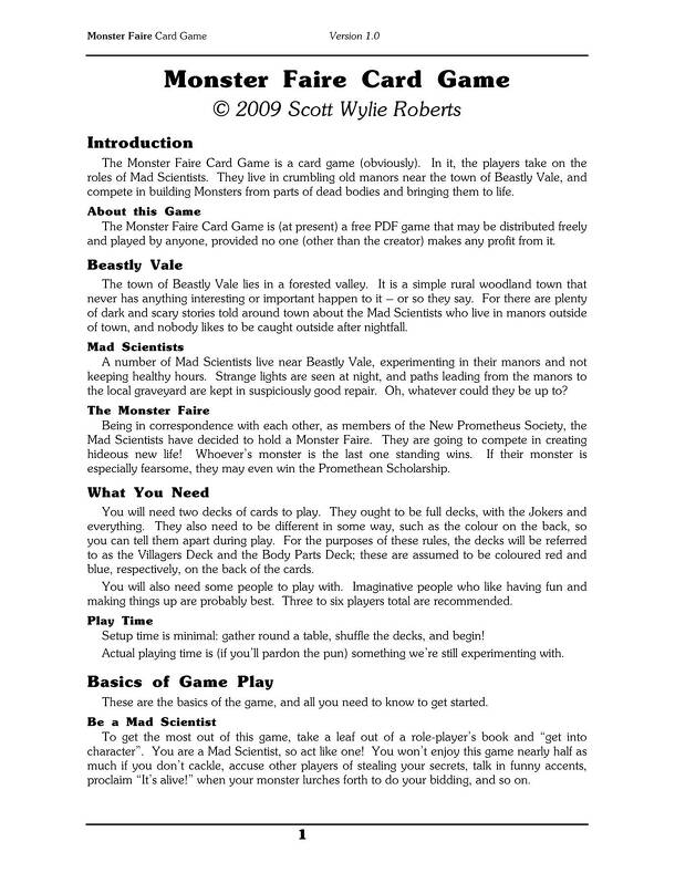 In Monster Faire Card Game, the players take on the roles of Mad Scientists. They live in crumbling old manors near the town of Beastly Vale, and compete in building Monsters from parts of dead bodies and bringing them to life. Requires two standard decks of playing cards, and recommended for three to six players. While not a true role-playing game as...