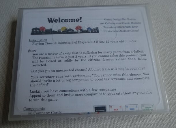 Welcome! is a card game from Japan. Players are trying to be the most successful mayor, attracting new businesses to their town, or lose the next election! The game turns on being able to build up a company and also be the only player appealing to that company. Players do this by card drafting and bluffing, openly or blindly, until a final reckoning. The...