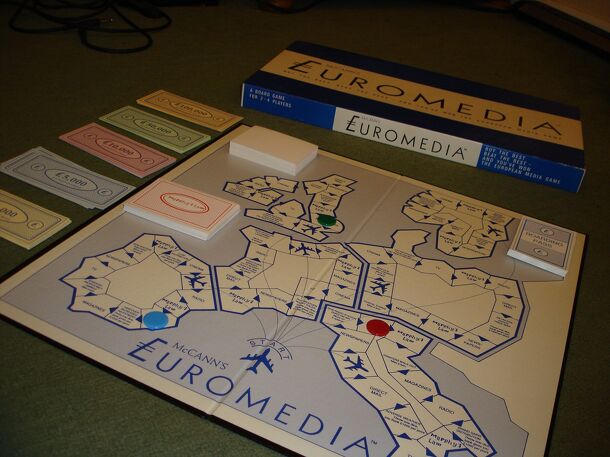 A simple roll-and-move game that requires the players to move around a representation of Europe. The object is to acquire three media campaigns in each country, trading with each other to complete your fledgling empire. The coloured playing pieces are drawn randomly at the beginning of the game, and will determine what market you must play to acquire: Mass...