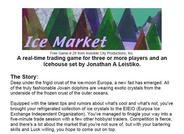 A real-time trading game for three or more players and an Icehouse set. "Deep under the frigid crust of the ice-moon Europa, a new fad has emerged. All of the truly fashionable Jovain dolphins are wearing exotic crystals from the underside of the frozen crust of the outer oceans. "Equipped with the latest tips and rumors about what's cool and what's not...
