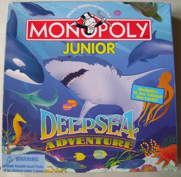 Join Mr. Monopoly in his submarine as he introduces kids to the exciting world of Monopoly and the fascinating creatures in the ocean. Players buy different marine animals for their aquariums (like the Great White Shark, Sea Otter and Octopus) and charge other players to see them. The diver with the most money and the most aquariums wins the game in this...