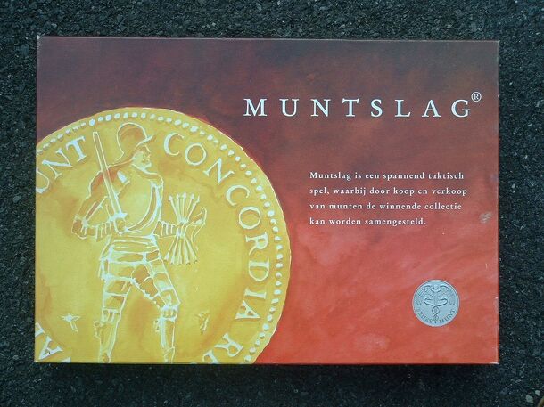 English translation from the box: Muntslag are a tense tactical game, where by buying and selling of currencies, the player can create the winning collection. The first player who has collected a series of currency on the market is the winner. The player builds its series of currency by buying and selling currencies on the market and trading with other...