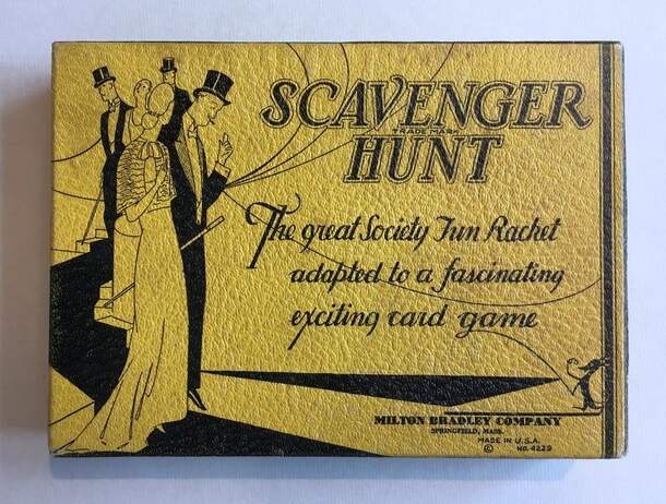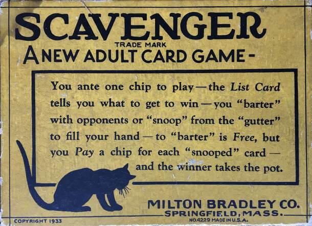 Subtitled "A New Adult Card Game", this Depression-era publication requires players to a set of cards either by trading with other players or by "snooping" in the "gutter". The game has 45 cards. The five Scavenger cards each list eight items that the player drawing it must collect. The other 40 cards are the items to be collected. Each player starts with...