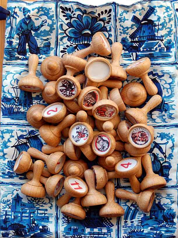 A traditional Dutch game from the Zeeland region, very similar to the version of the Danish-Norwegian game Gnav or the Swedish Kille, played with wooden pawns rather than cards, of which it is a derivative; all of these games are actually reimplements of the 16th century French 'hazard' card game Coucou, later popularized in 17th century Italy as Cuccú...