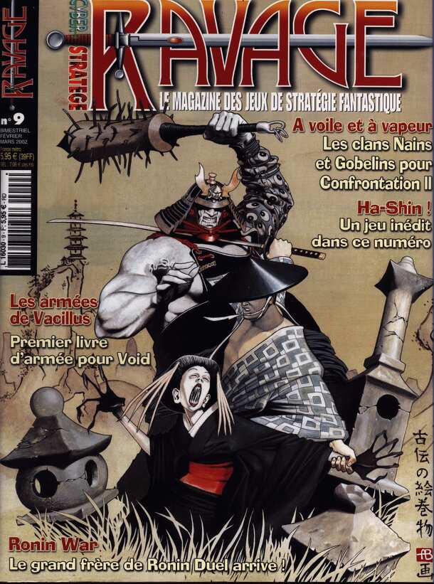 Ha-Shin is a tabletop miniature wargame set in fantasy medieval Japan, where the forces of Light battle the forces of Darkness. It was published in issue #9 (February 2002) of Ravage, a French miniature wargaming magazine. Each mini has several stats describing its ability to move, shoot, fight and use "Chi" powers. The most important is Action Points (AP)...