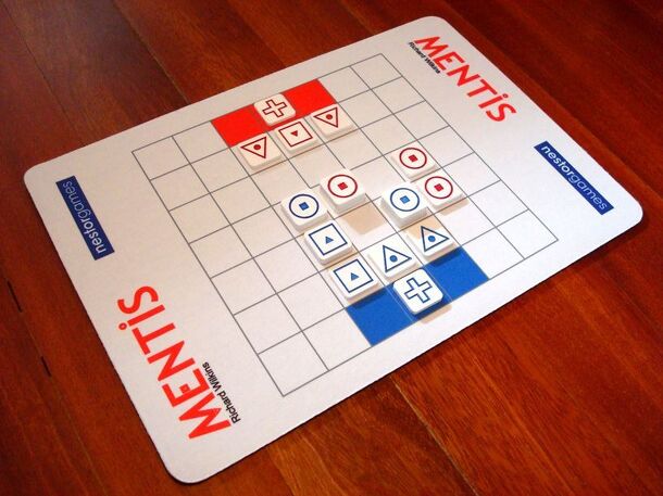 In Mentis, your goal is to capture the opponent's king. Each player's king is fragile, unable to move from his hill on the side of the 7x7 board, but he defends that hill by sending out forces of Spears, Trenchmen and Nobles to fight across the board. Each turn, you either deploy, move or capture: Deploy — Place 1-3 pieces in a stack orthogonally adjacent...