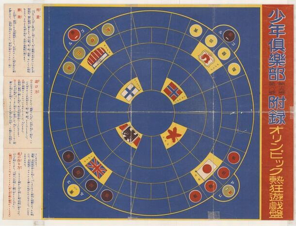 オリンピック熱狂遊戯盤 [= Olympic frenzy board game] Board game issued August 1932 as a supplement to volume 19, no. 8 of the monthly magazine "Shonen Club". The game was produced at the time of the 1932 Los Angeles Olympics. Four players represent the USA, France, Japan and the UK. Each has 4 starting counters (athletes), who must move to the centre of the circular...