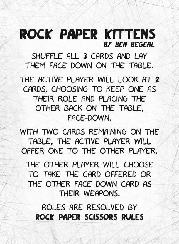 Ben Begeal's Rock Paper Kittens is an RPS game that pauses for some social shenanigans. All 3 cards are shuffled and placed face down on the table. The active player will look at 2 cards, choose to keep one as their role and placing the other back on the table face down. With two cards remaining, the active player will offer one to the other player. That...